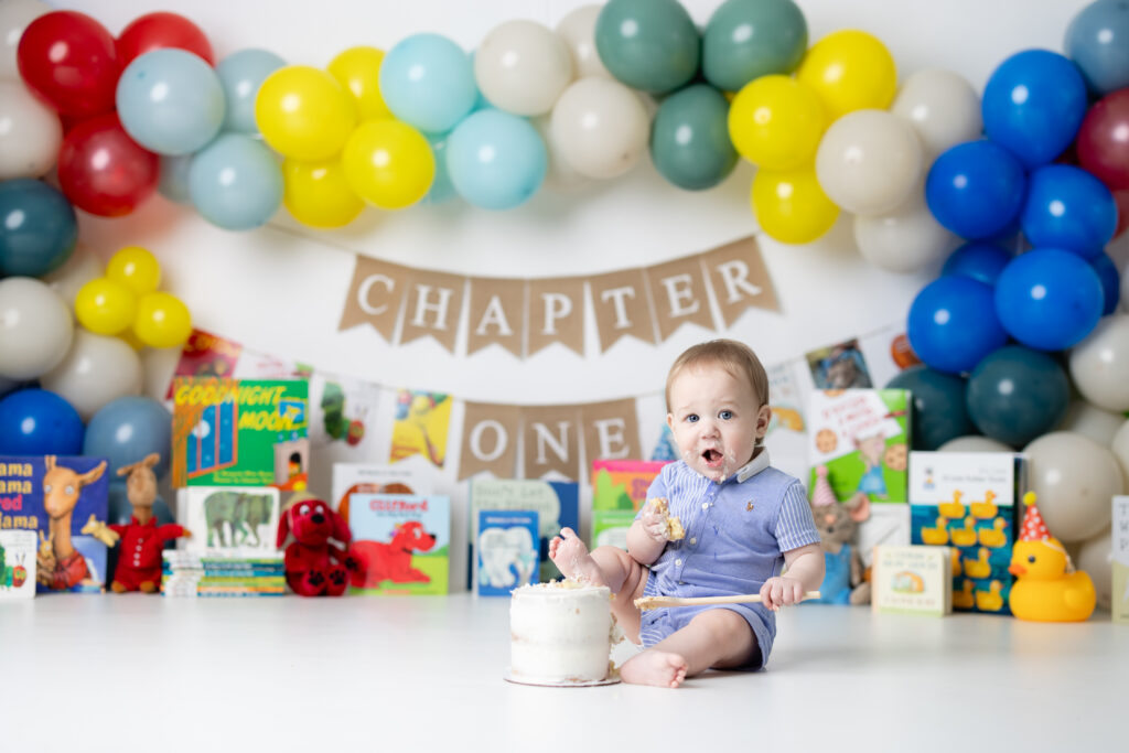For this Chapter ONE Cake Smash Canton GA, we created a clean, bright setup layered with colorful children’s books, soft neutral banners, and a balloon garland in blues, yellows, and creamy neutrals. The “Chapter ONE” banner tied everything together perfectly.